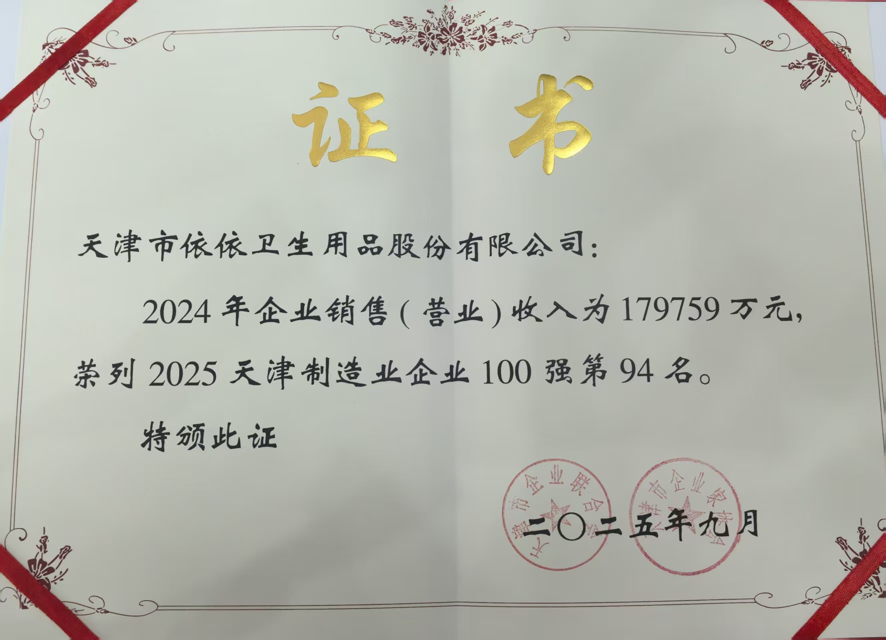 依依股份榮列2025天津制造業(yè)企業(yè)100強(qiáng)第94名